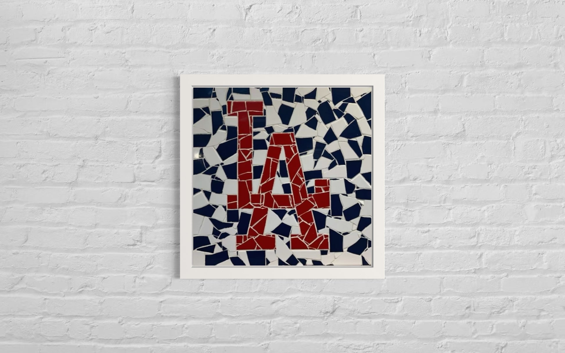 Iconic LA logo in ceramic mosaic on board using USA coloured tile. 55x55cm framed in white oak. Every pieces comes with certificate of authenticityÂ