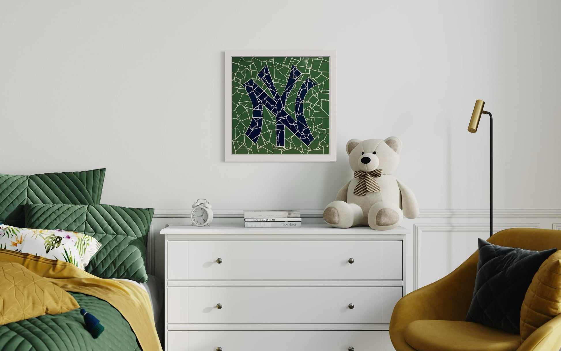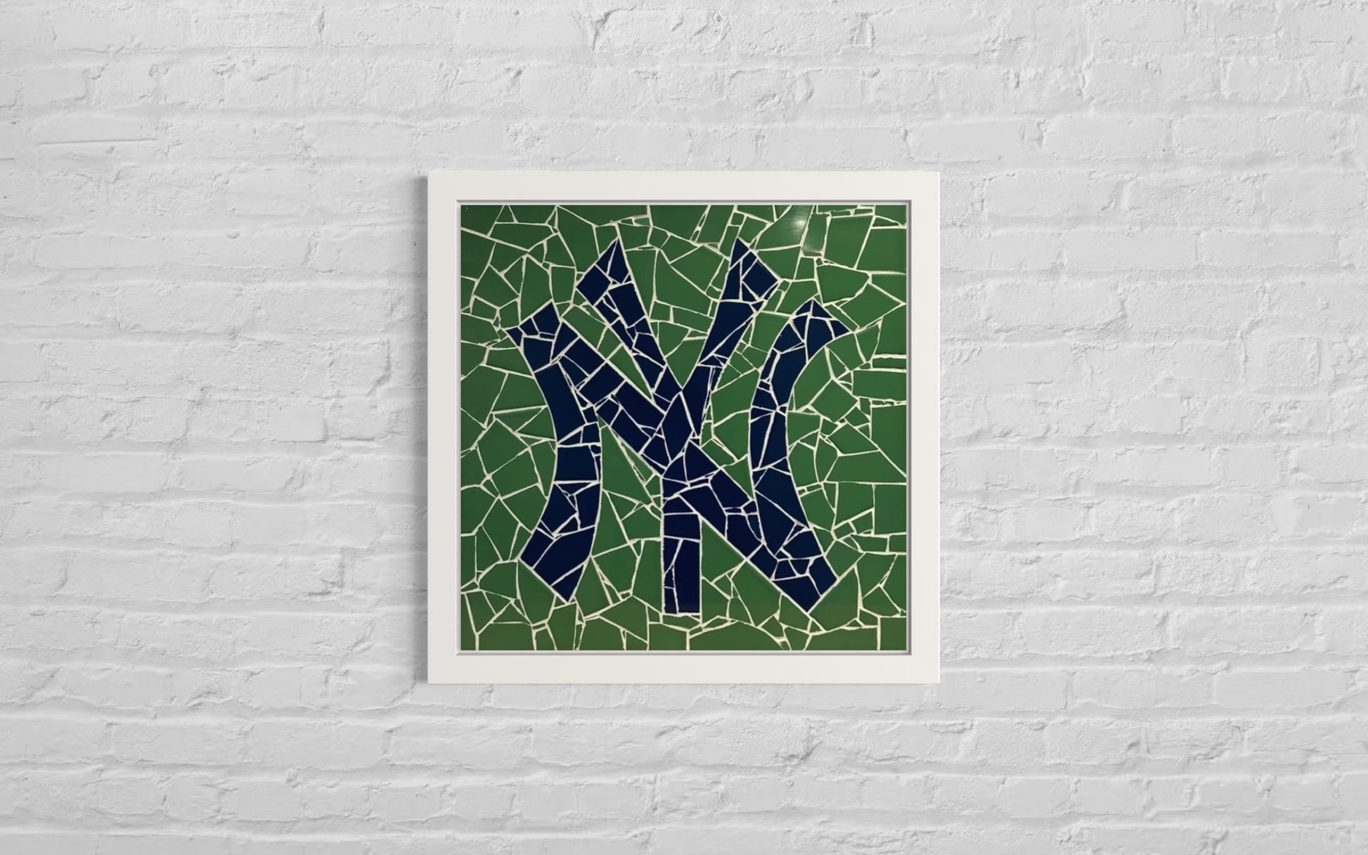 Iconic NY logo in ceramic mosaic on board, framed in white oak.